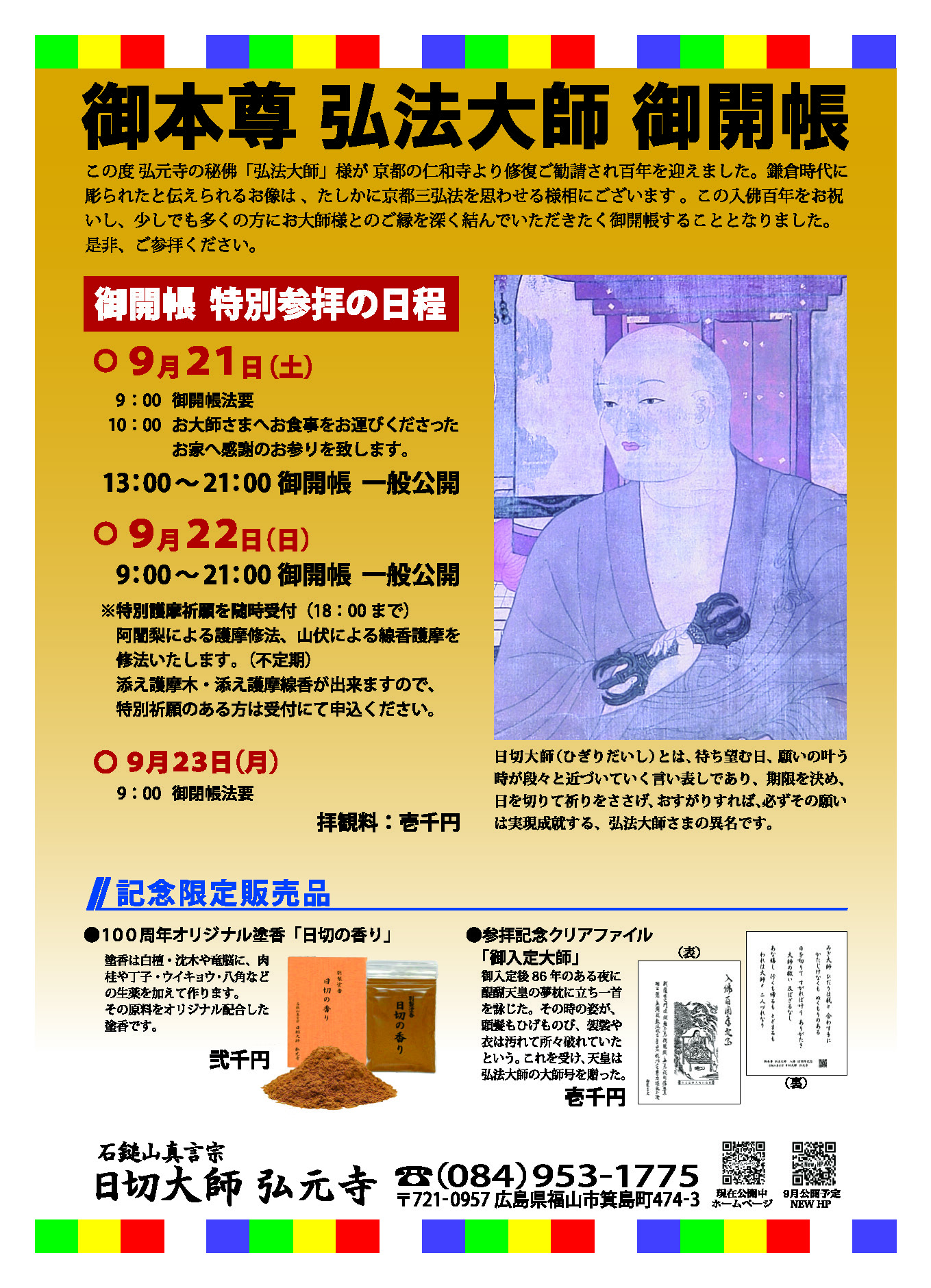 | 時間 | 9月21日(土)13:00~21:00御開帳 一般公開、 9月22日(日)9:00~21:00御開帳 一般公開、 9月23日(月)9:00御開帳法要 |